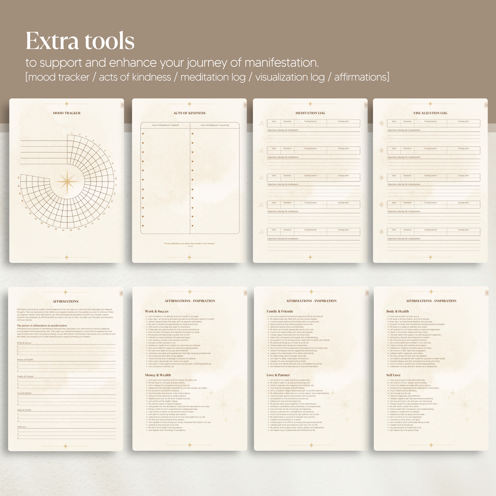 ✦ Extra Tools – Includes a mood tracker, affirmations, acts of kindness log, and meditation/visualization logs to deepen your practice.